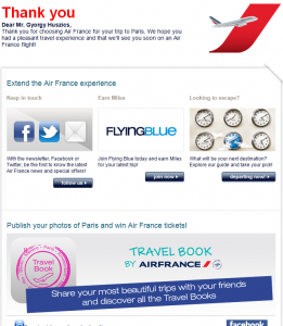 Néhány napos párizsi kiruccanásunkhoz az Air France-ot választottuk. A hazatérésünk utáni napokban kaptam tőlük apró figyelmességük jeleként az e-mailt, melyben megköszönték, hogy rájuk esett a választásunk, és mindjárt felhívták rá a figyelmünket, hogy miért érdemes legközelebb is velük tartanunk. És, ha már billentyűzetet ragadtak emiatt, akkor még néhány apróság is felhívták a figyelmemet. A hűségprogram mellett felhozták még érvként aktuális ajánlataikat, sőt még egy „útitervezőt” is belinkeltek (ugyan még csak indulófélben van), ahol a városok között böngészve lehet újabb célpontot választani. Meg persze az aktuális promót is megemlítették, ahol repjegyet nyerhetek párizsi fotóinkkal és tippjeinkkel (gondolom, ez megy majd vissza az „útitervezőbe”). Ennyi. Meg annyi, hogy az ember úgy érzi, hogy foglalkoznak vele. Mindez akkor, amikor a márkák görcsösen keresik azokat a pillanatokat, amikor megszólíthatják vásárlóikat, és amikor a vásárlók egyre érzékenyebbek ezekre a megkeresésekre. Úgy látszik, mégis vannak kiaknázatlan területek. Olyan helyzetek, amikor nem zaklatásnak éli meg az ember, hogy megkeresték. Köszi, Air France.